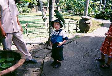 | 23日 この日は朝から、カデとカデのバイクで、「バードパーク」へ行く約束をしていまし た。 同じホテルに泊まってるSさんに言ったら 車に乗せてってくれるってことなので、カデがホテルに迎えに来て 3人でサヌ−ルのちょっと先にあるバードパークへ行きました。 バイクで行きたい気もしたけど、車も楽だしまーいいか。 バードパークは鳥類のエリアと爬虫類のエリアに別れていてかなり広かった。 鳥のエリアには、バリにしかいない珍しい鳥とか思ったより充実してました。 サングラスを臭い水の中に落としてしまったのですが カデが手をつっこんで拾ってくれたので助かりました。 爬虫類のエリアでは、イグアナを抱っこして写真を撮りました。 イグアナの感触は、表面はぬめっとしてて中はぷにゅって感じでなかなか・・いい感 じ・・。 しっぽで叩かれのはちょっと痛かったけど。 バードパークから帰って、少し休憩していつもの友達のいるビーチへ。 (ここで訂正なのですが、22日の後半のお話は23日のことです。 22日の日記を書いた時、勘違いしていました。 だからこの後のことは23日の結婚式の後の文に続きまーす。 22日の後半は、ホテルの前のビーチで乗ってました。) 夜はアユは仕事だったので、マデとSさんと3人でナイトマーケットで ナシゴレンを食べて、その後わたしの部屋で3人でビールとか バリの地酒のアラックを飲みました。